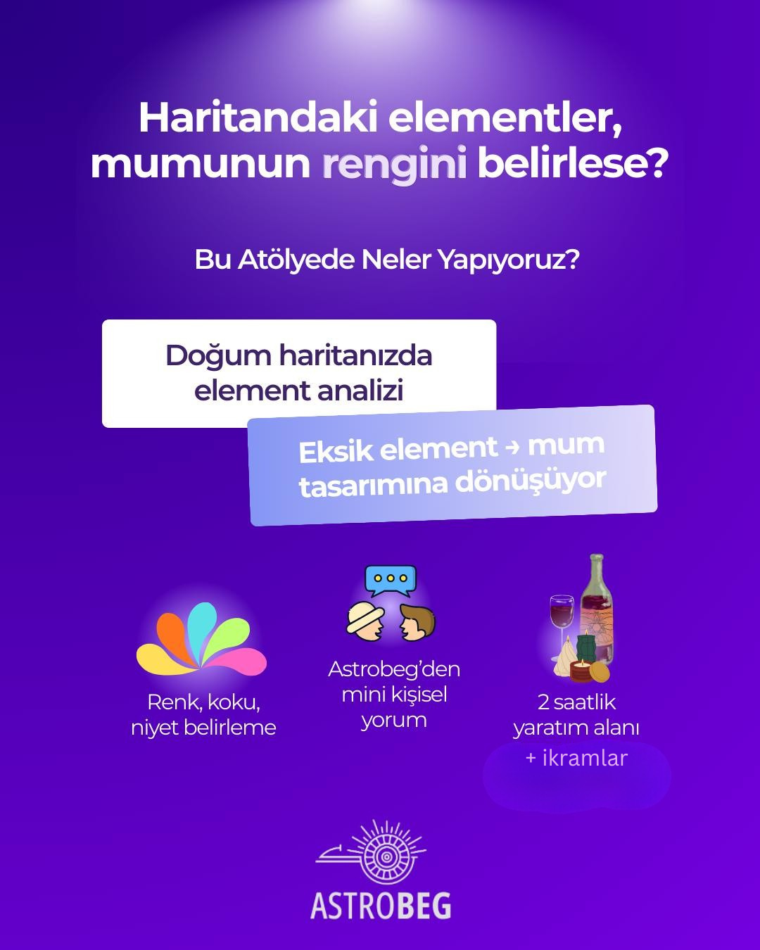 Bu atölyede, doğum haritanızdan yola çıkarak element dağılımınız incelenir ve eksik kalan alanları dengelemeye yönelik bir deneyim alanı açılır. Şarap eşliğinde, yavaşlayan bir zaman akışında kendi mumunuzu tasarlarken, niyetinizi somut bir objeye dönüştürürsünüz.